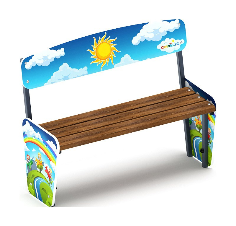 Скамейка детская Солнышко - МФ 41.01.03-И1 Габариты (ШхДхВ): 1180х420х530 мм Зона безопасности, мм: 2180х1420 Возрастные ограничения от 3 лет