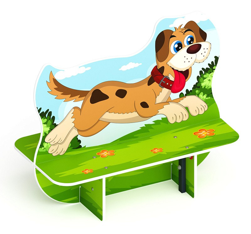 Пес - Скамейка детская - МФ 41.01.02 Габариты (ШхДхВ): 1180x620x1040 мм Зона безопасности, мм: 2180х1620 Возрастные ограничения от 3 лет