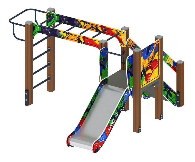 Карапуз (Граффити) - ДИК 1.001.02-03 - Игровой комплекс Н=750 Габариты (ШхДхВ): 2670x2680x1500 Зона безопасности, мм: 6170х5680 Скат горки: H=750 (металлический скат)