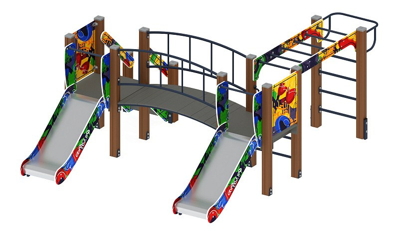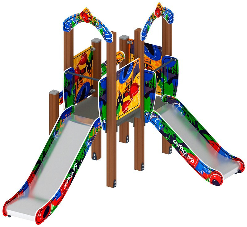 Карапуз (Граффити) - ДИК 1.001.07-03 - Игровой комплекс Н=750 Н=900 Габариты (ШхДхВ): 2670x3140x2500 Зона безопасности, мм: 6640х6170 Скат горки: H=750 (металлический скат) / H=900 (металлический скат)