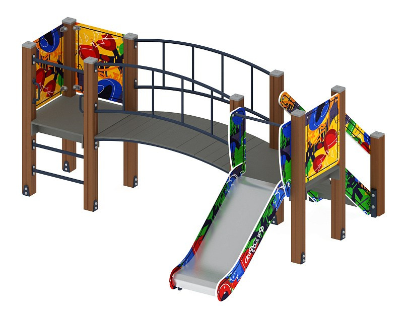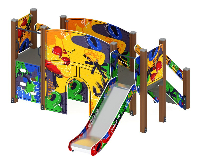 Карапуз (Граффити) - ДИК 1.001.05-03 - Игровой комплекс Н=750 Габариты (ШхДхВ): 3910x3060x1600 Зона безопасности, мм: 6060х7410 Скат горки: H=750 (металлический скат)