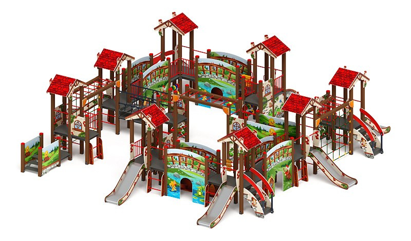 В гостях у сказки - ДИК 1.05.01-08.С - Игровой комплекс H=900 Габариты (ШхДхВ): 8600x7100x2790 Зона безопасности, мм: 12600х11100 Скат горки: H=900 (металлический скат)