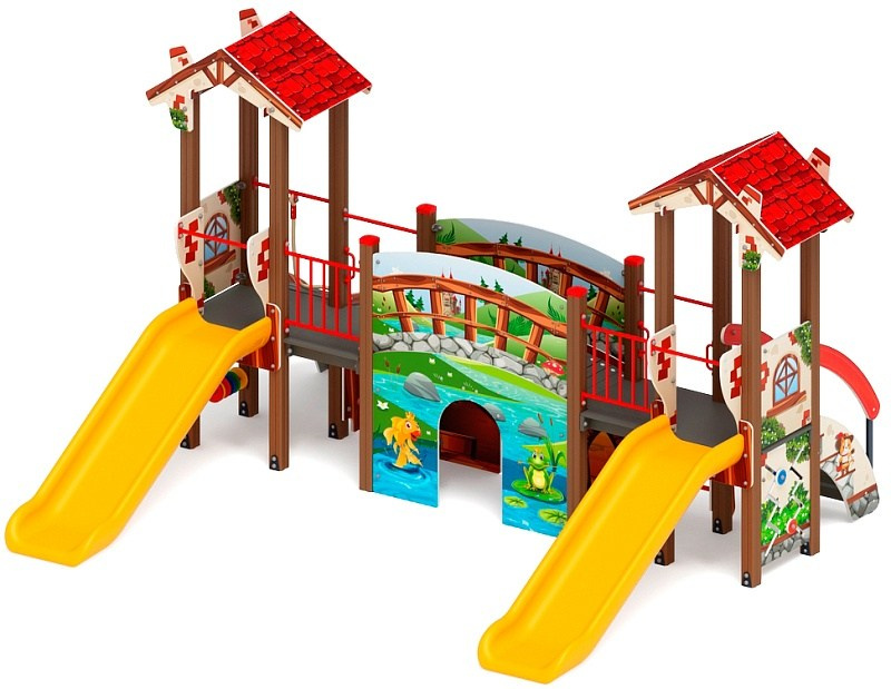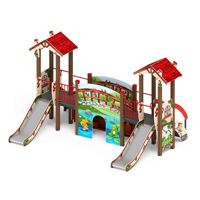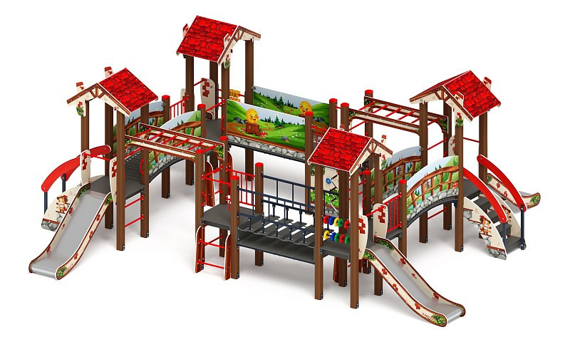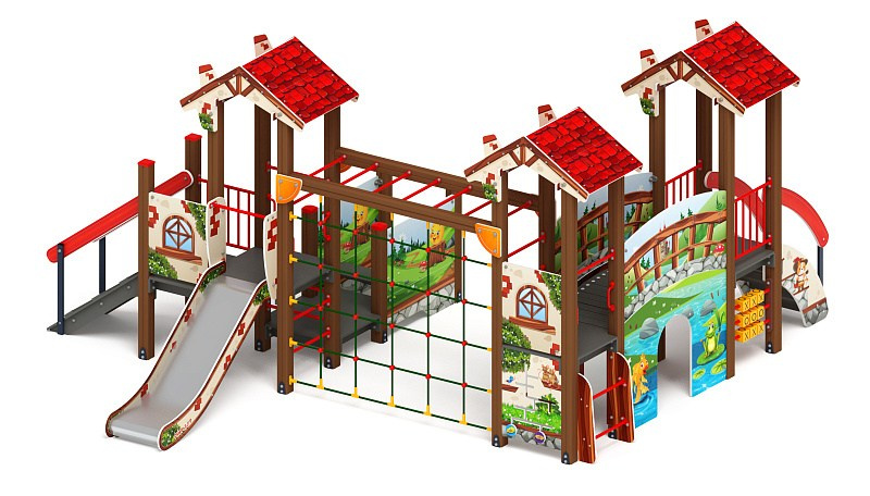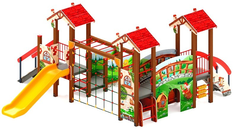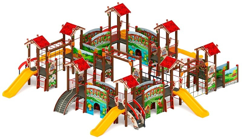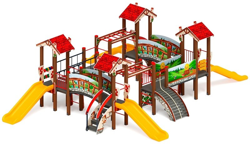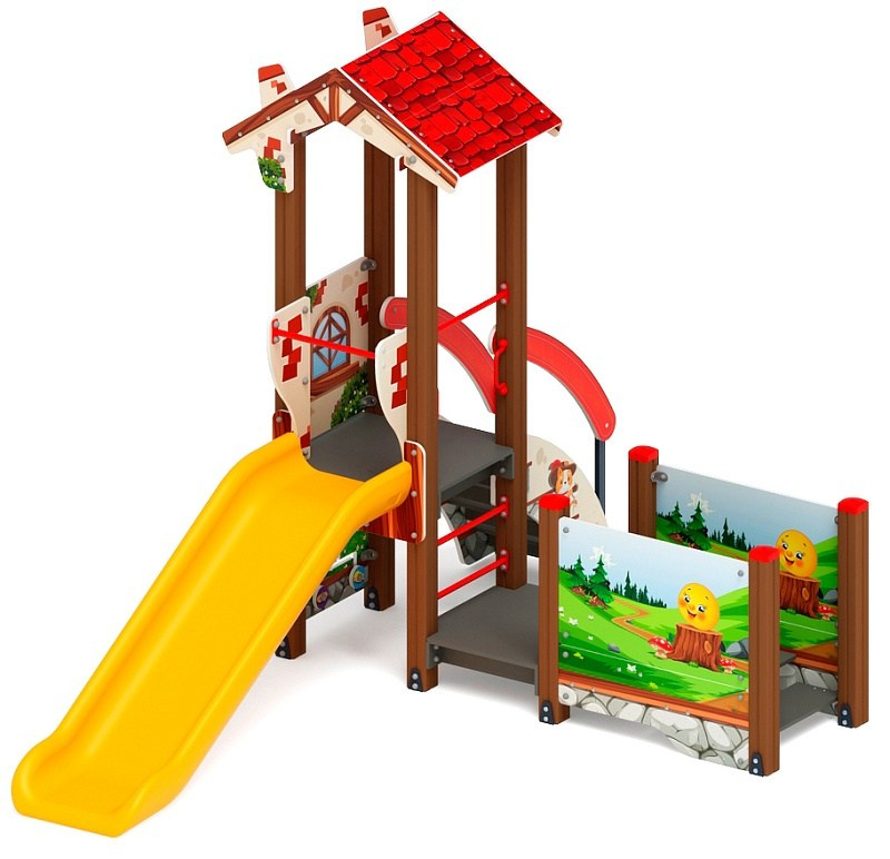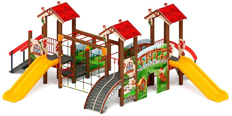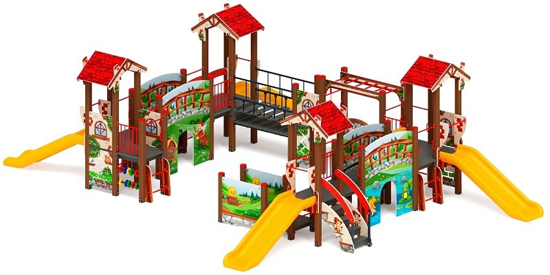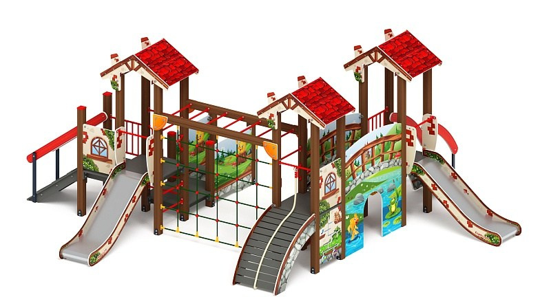 В гостях у сказки - ДИК 1.05.01-05.С - Игровой комплекс H=900 Габариты (ШхДхВ): 3290x2800x2790 Зона безопасности, мм: 6790х5800 Скат горки: H=900 (металлический скат)