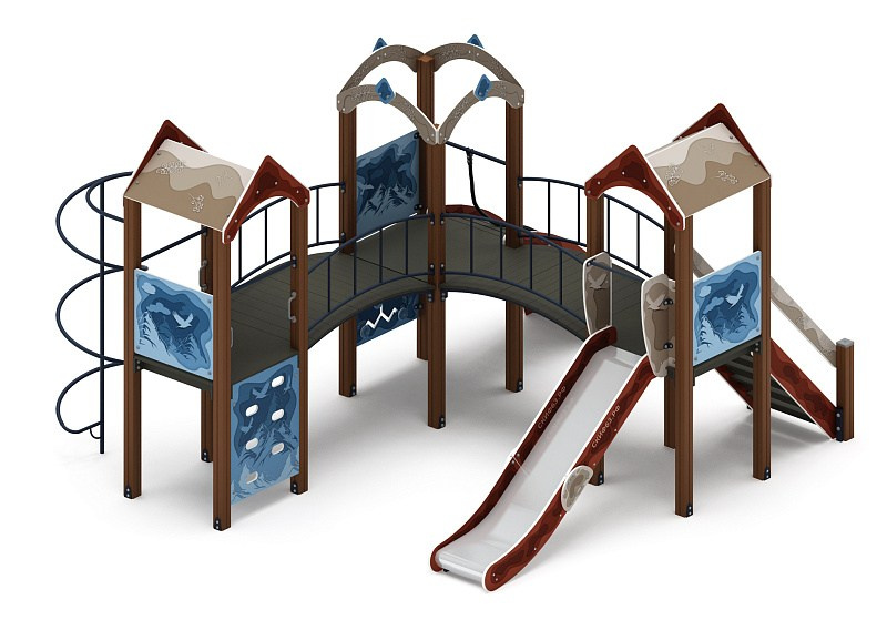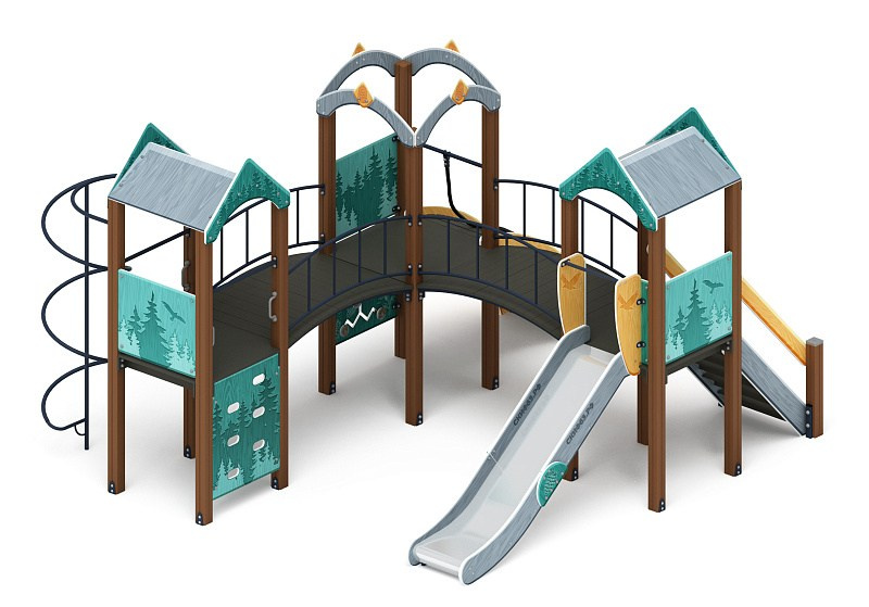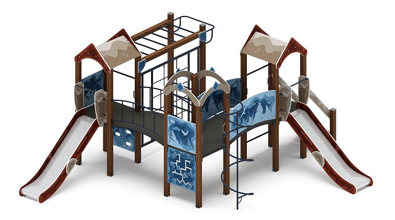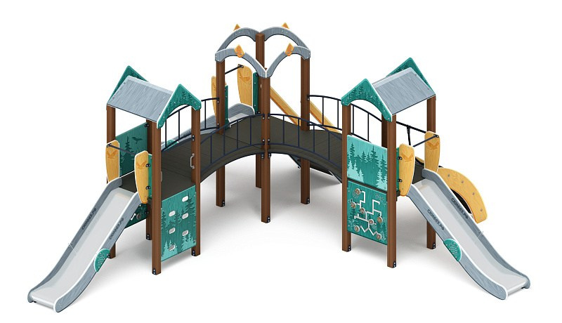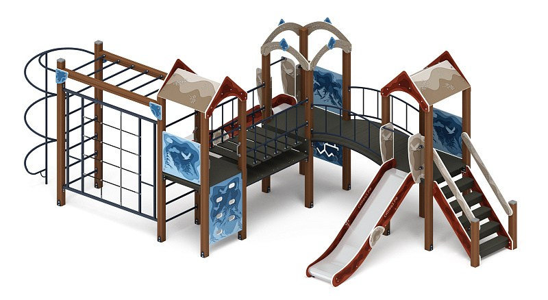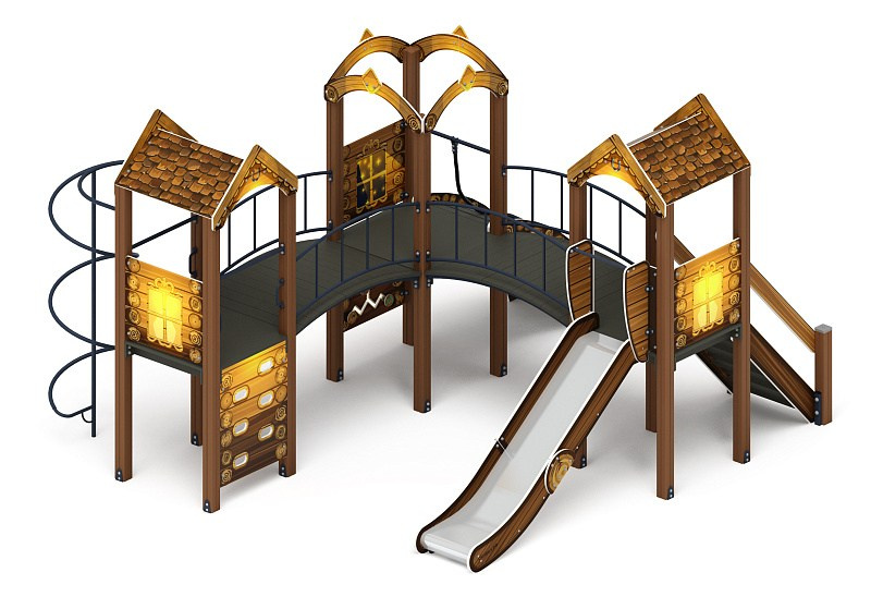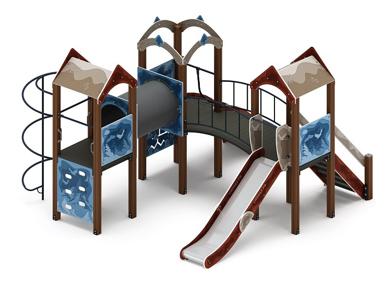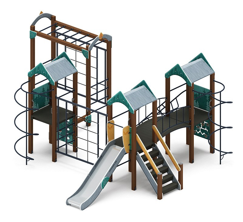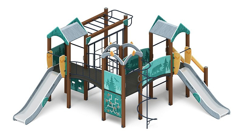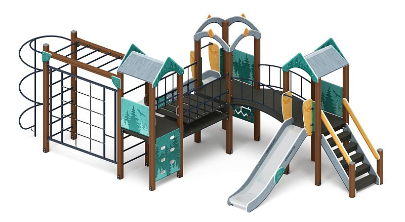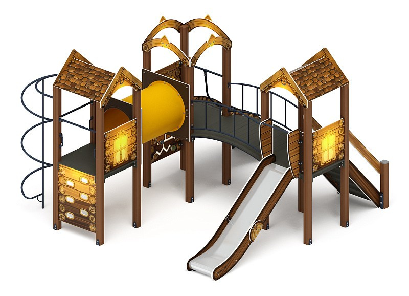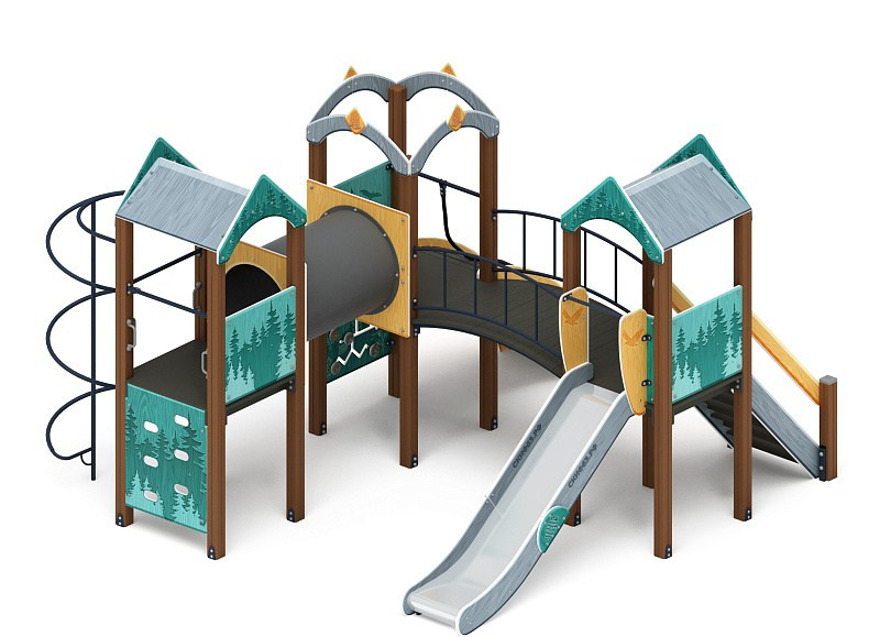 Городок (Тайга) - ДИК 2.01.3.03-33 - Игровой комплекс H=1200 Габариты (ШхДхВ): 6920x7700x3000 Зона безопасности, мм: 10420х11700 Скат горки: H=1200 (металлический скат)