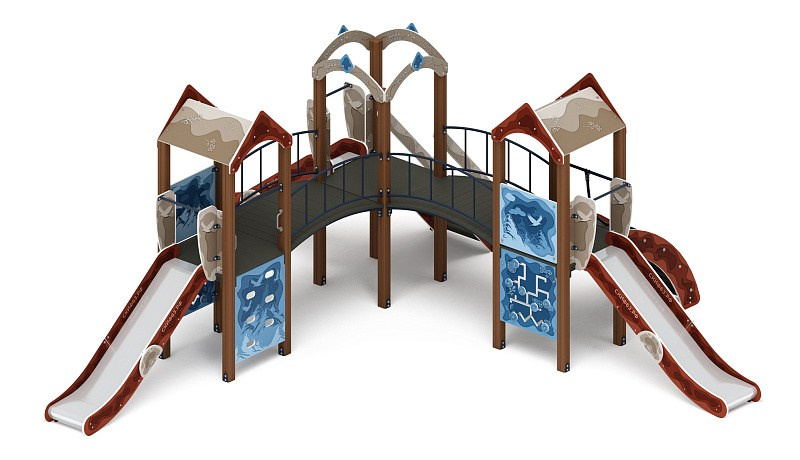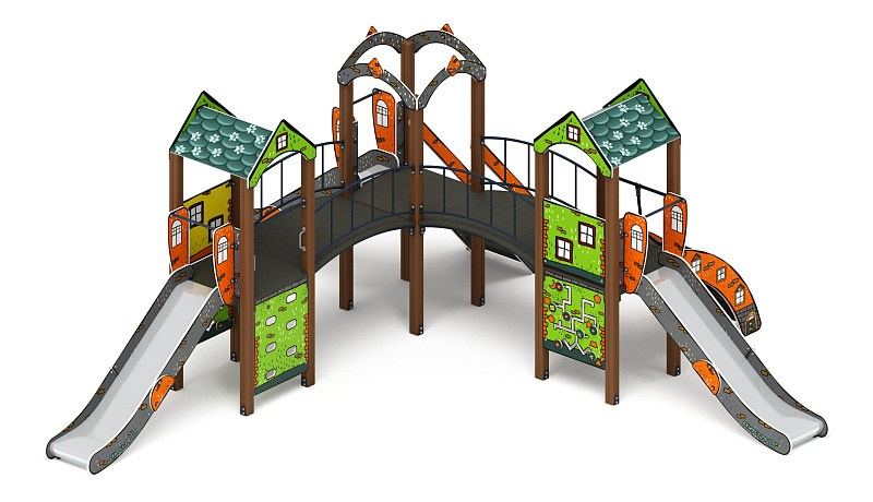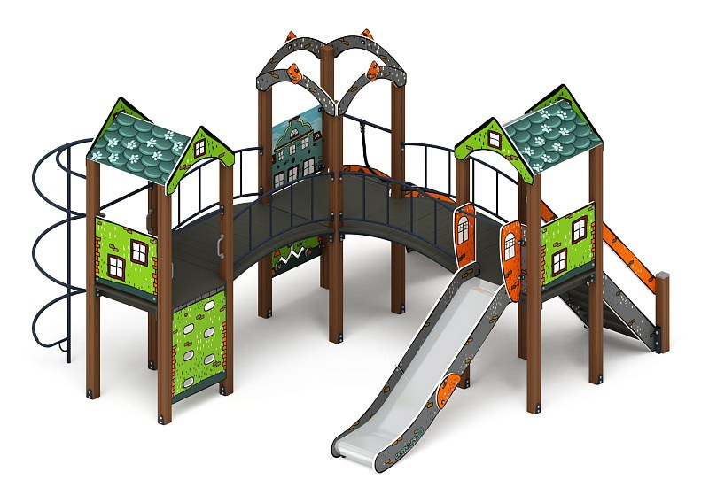 Городок (Город) - ДИК 2.01.3.03-01 - Игровой комплекс H=1200 Габариты (ШхДхВ): 4820x4500x3000 Зона безопасности, мм: 7910х7500 Скат горки: H=1200 (металлический скат)