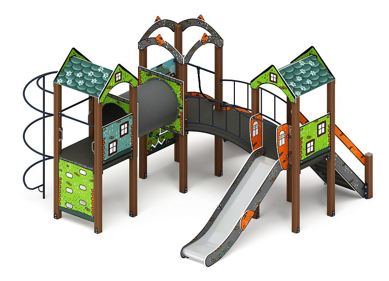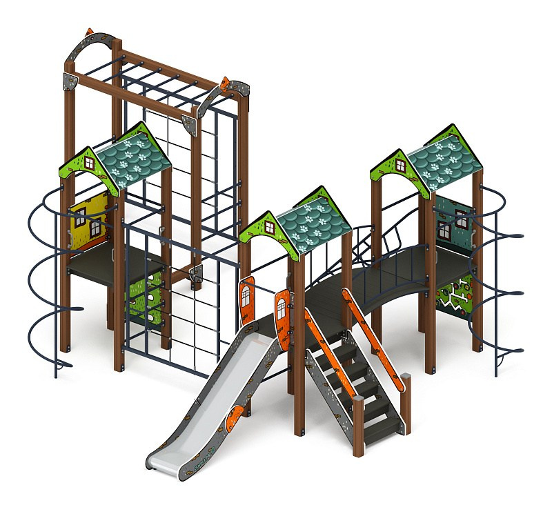 Городок (ЭКО) - ДИК 2.01.3.03-02 - Игровой комплекс H=1200 Габариты (ШхДхВ): 4820x4500x3000 Зона безопасности, мм: 7910х7500 Скат горки: H=1200 (металлический скат)