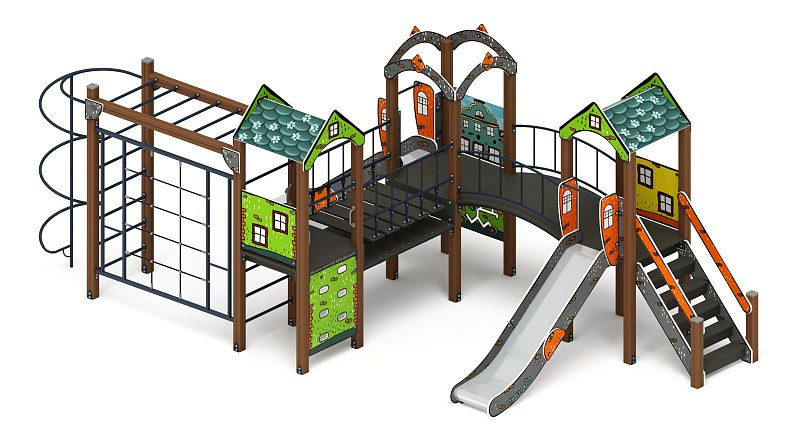 Городок (Город) - ДИК 2.01.3.04-01 - Игровой комплекс H=1200 Габариты (ШхДхВ): 5600x7100x3000 Зона безопасности, мм: 9100х10100 Скат горки: H=1200 (металлический скат)