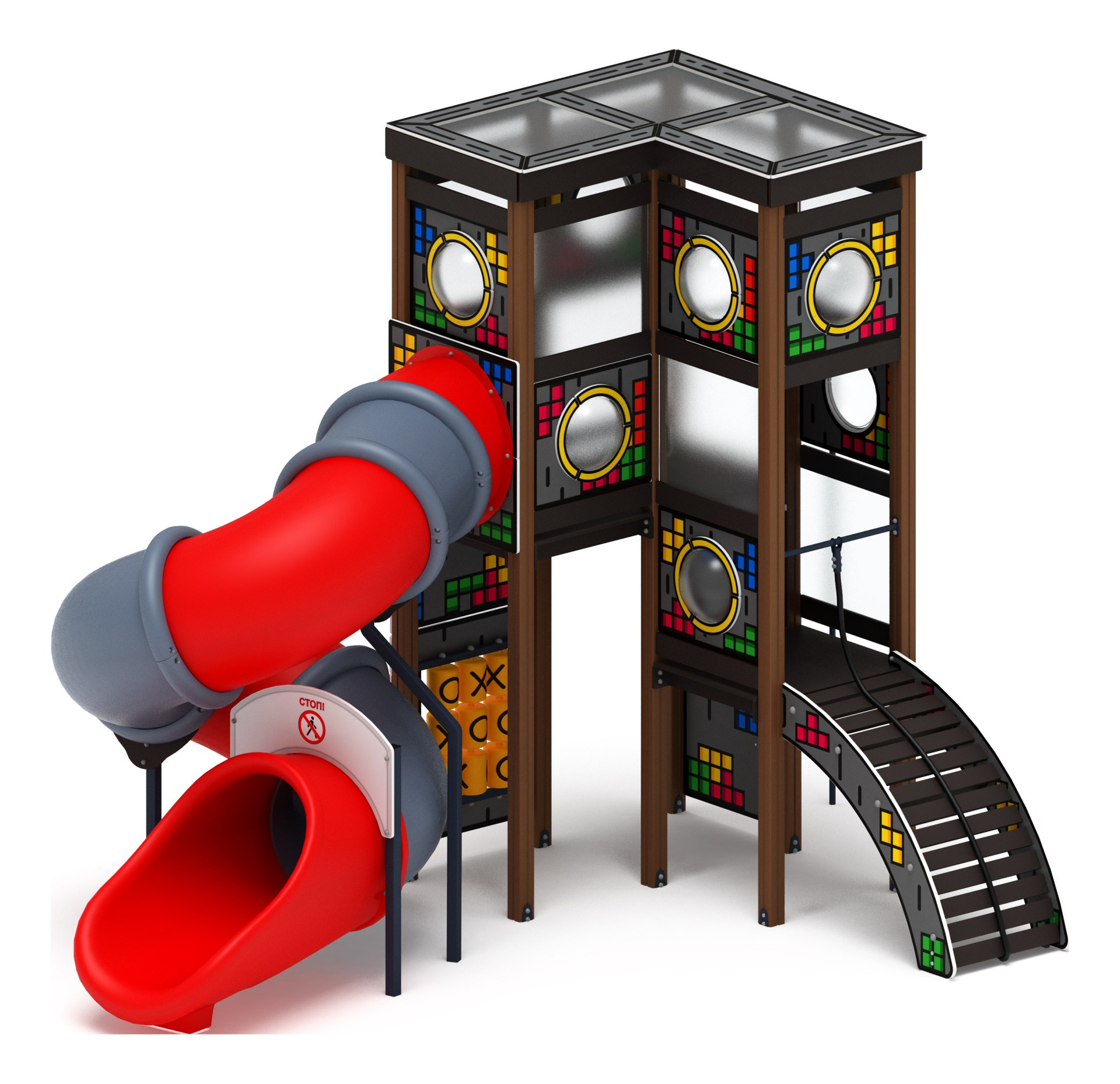 Куб (Тетрис) горка Н 2000 - ДИК 2.23.01-02.01 Габариты (ШхДхВ): 11715х9965х4030 Зона безопасности, мм: 14715х14400 Скат горки: H=2000 (тоннельный винтовой скат) Возрастные ограничения от 5 до 12 лет
