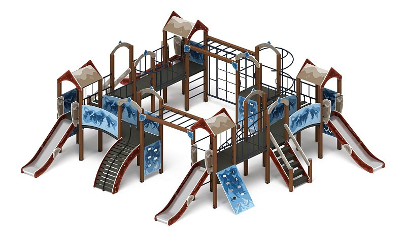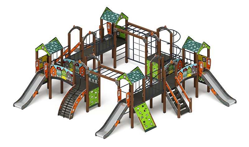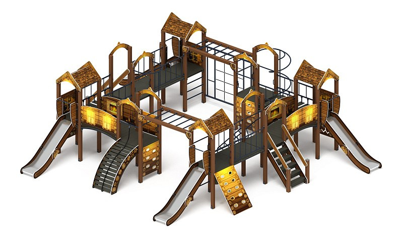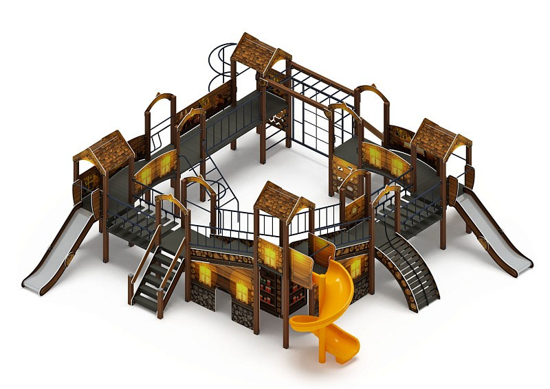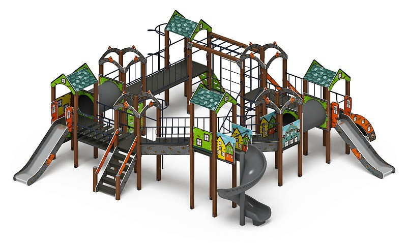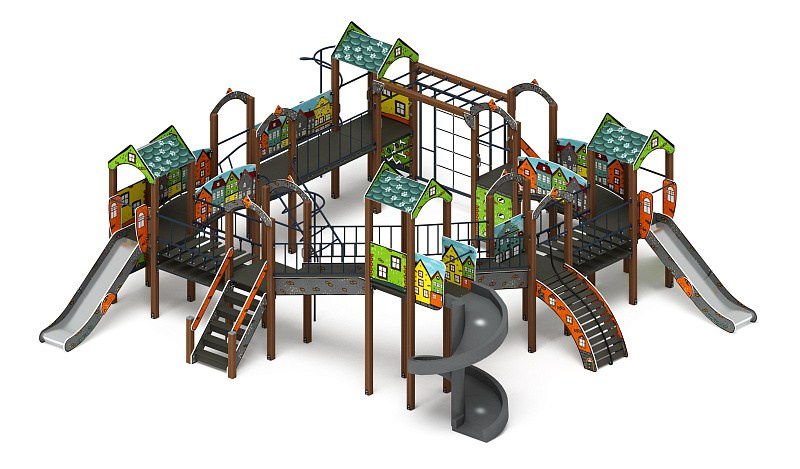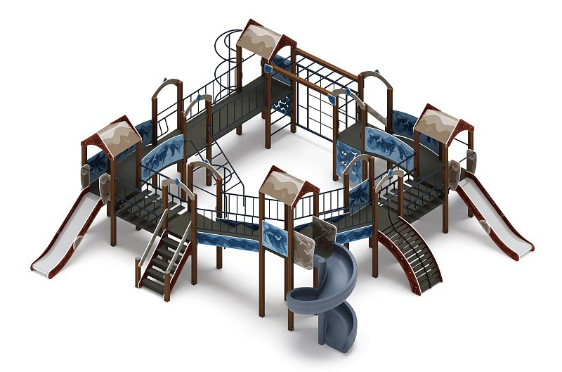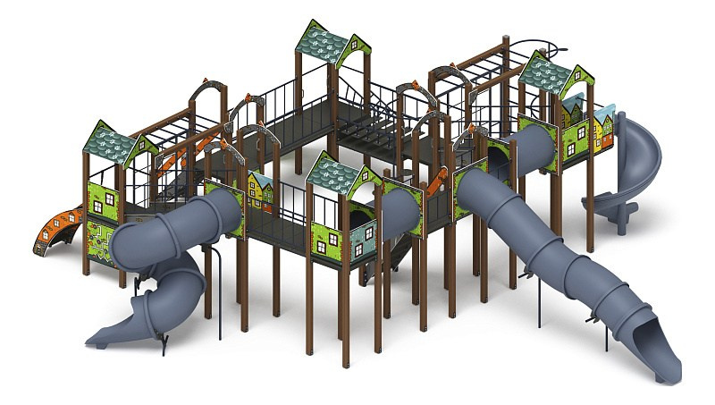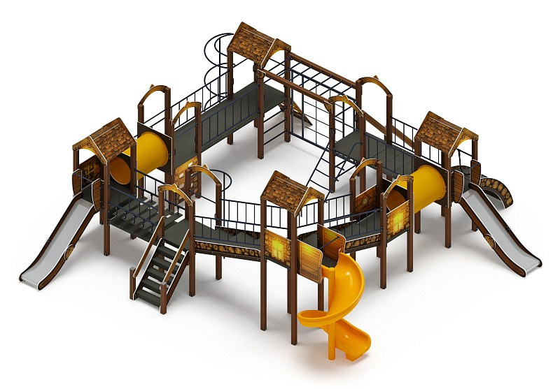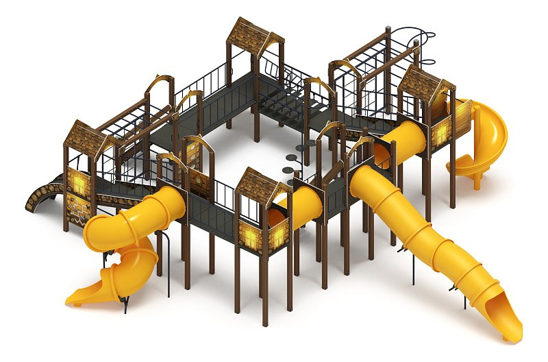 Остров детства (Калейдоскоп) (Винтовой скат) - ДИК 2.01.8.02-45 - Игровой комплекс H=2000, H=1200, Н=750 Габариты (ШхДхВ): 11200х9390х3970 Зона безопасности, мм: 15200х12890 Скат горки: H=750 (металлический скат) / H=1200 (металлический скат) / H=2000 (тоннельный винтовой скат) / H=2000 (тоннельный прямой скат)