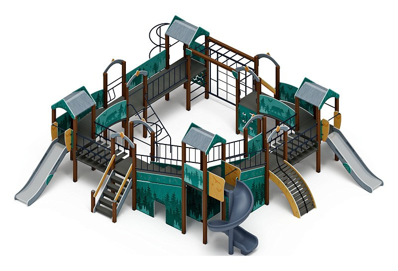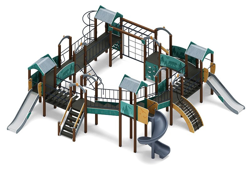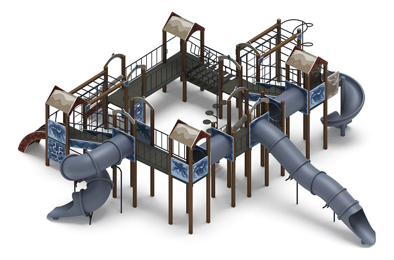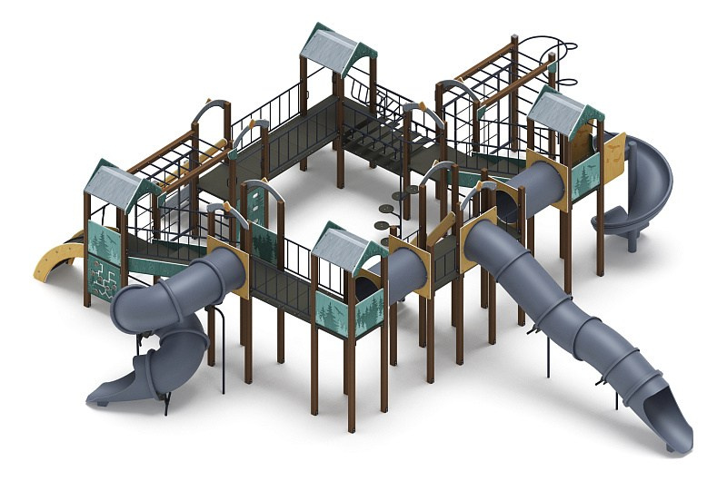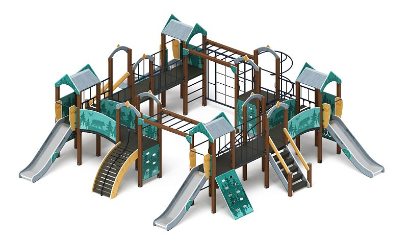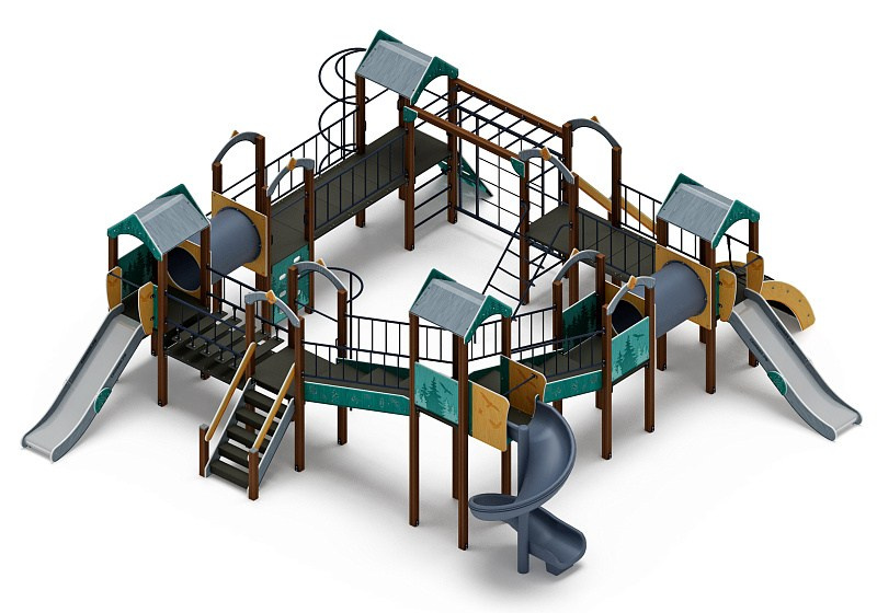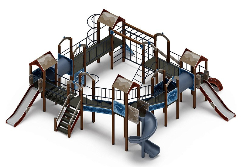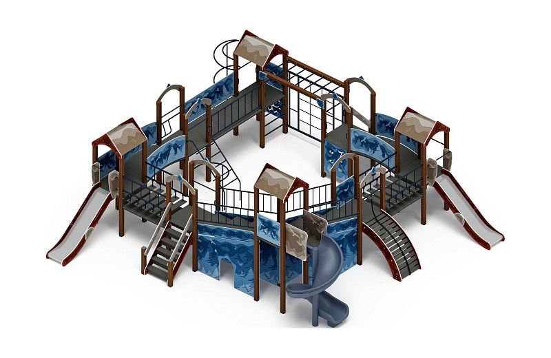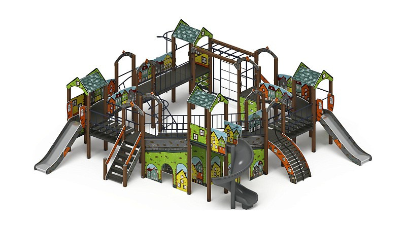 Остров детства (Калейдоскоп) (Винтовой скат) - ДИК 2.01.8.02-45 - Игровой комплекс H=2000, H=1200, Н=750 Габариты (ШхДхВ): 11200х9390х3970 Зона безопасности, мм: 15200х12890 Скат горки: H=750 (металлический скат) / H=1200 (металлический скат) / H=2000 (тоннельный винтовой скат) / H=2000 (тоннельный прямой скат)