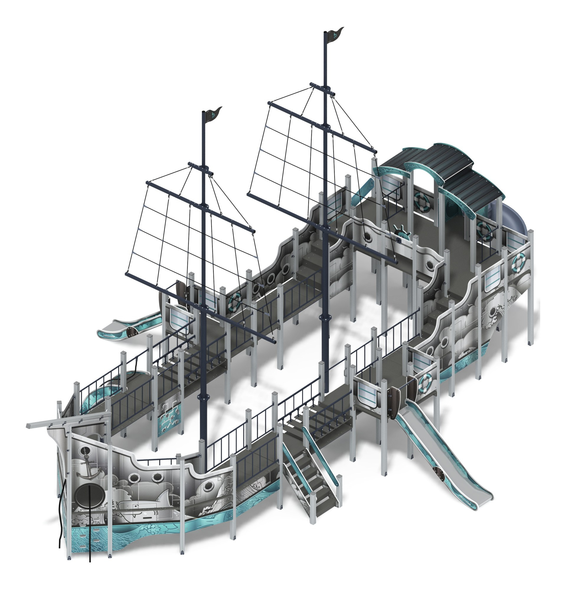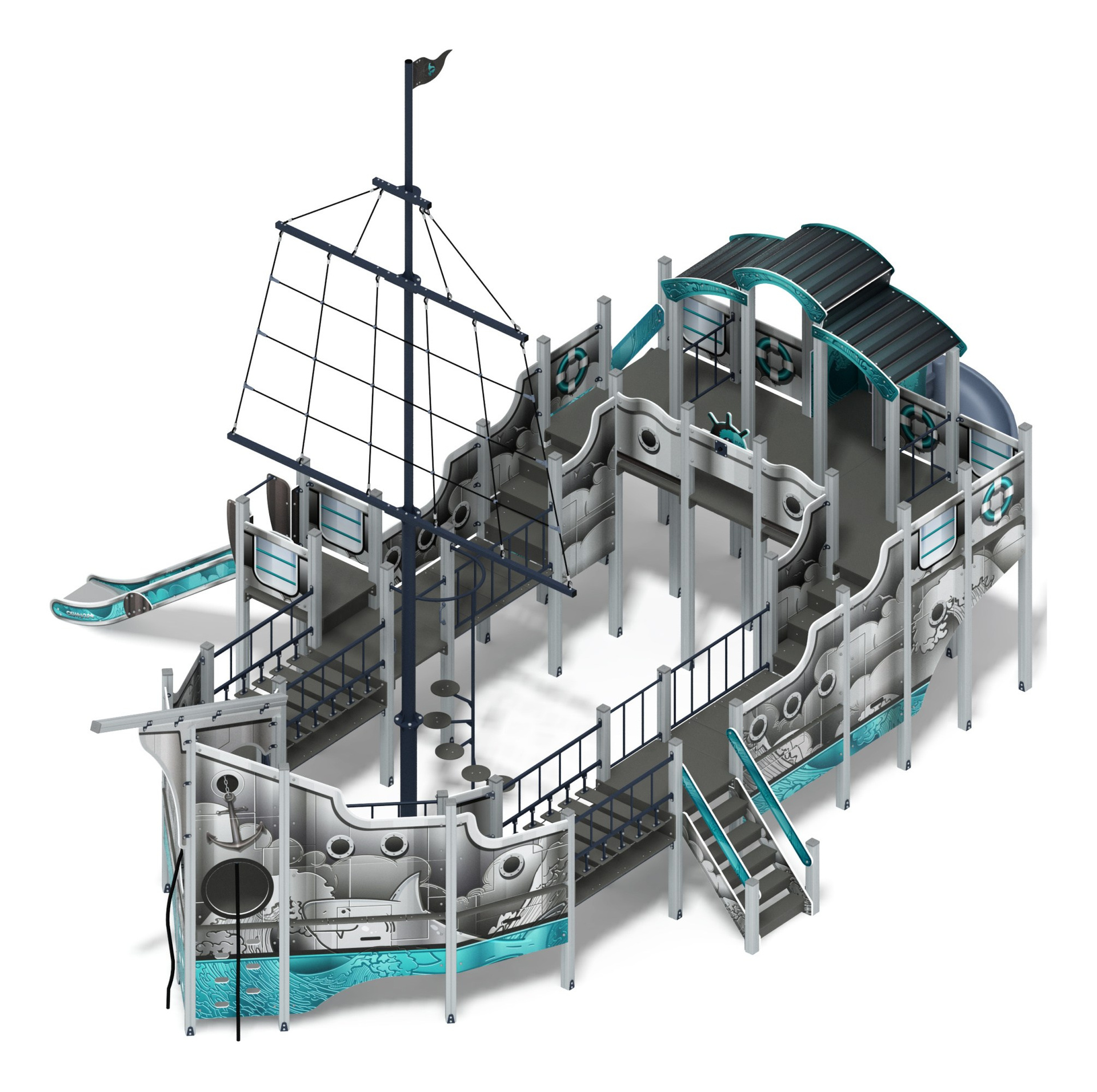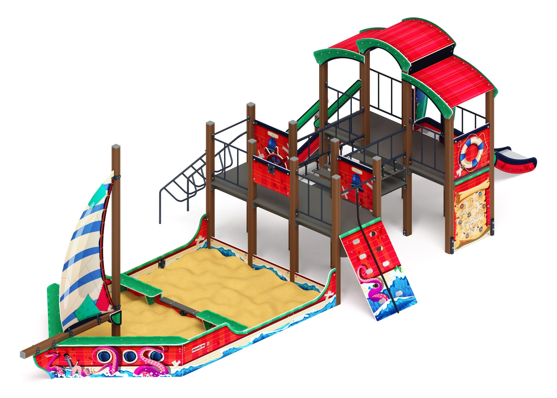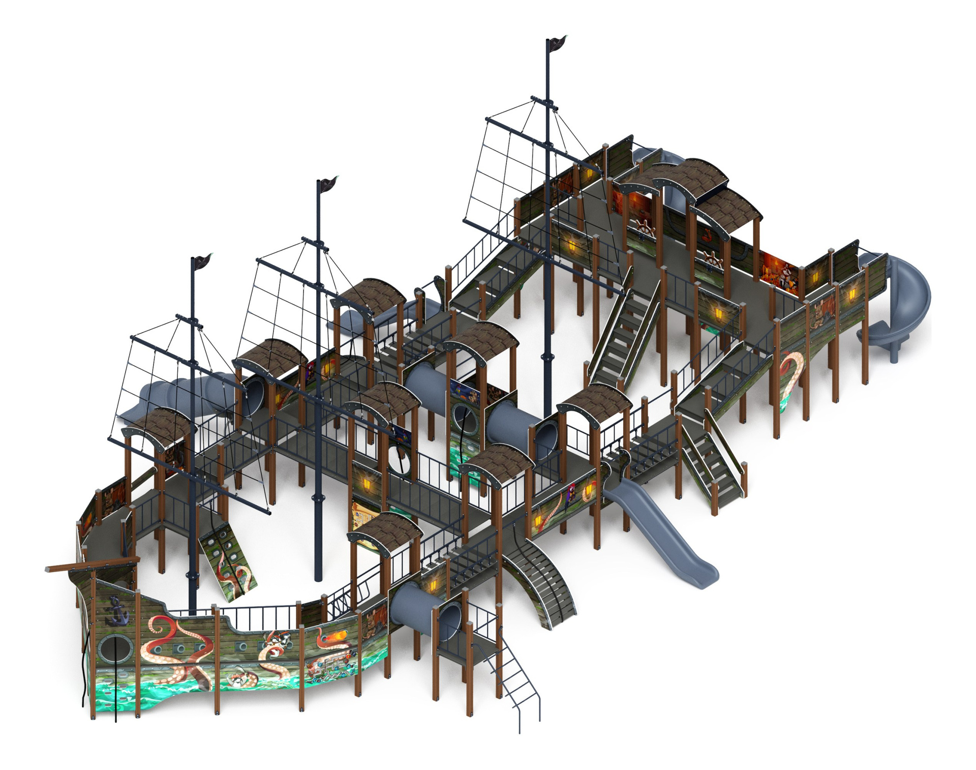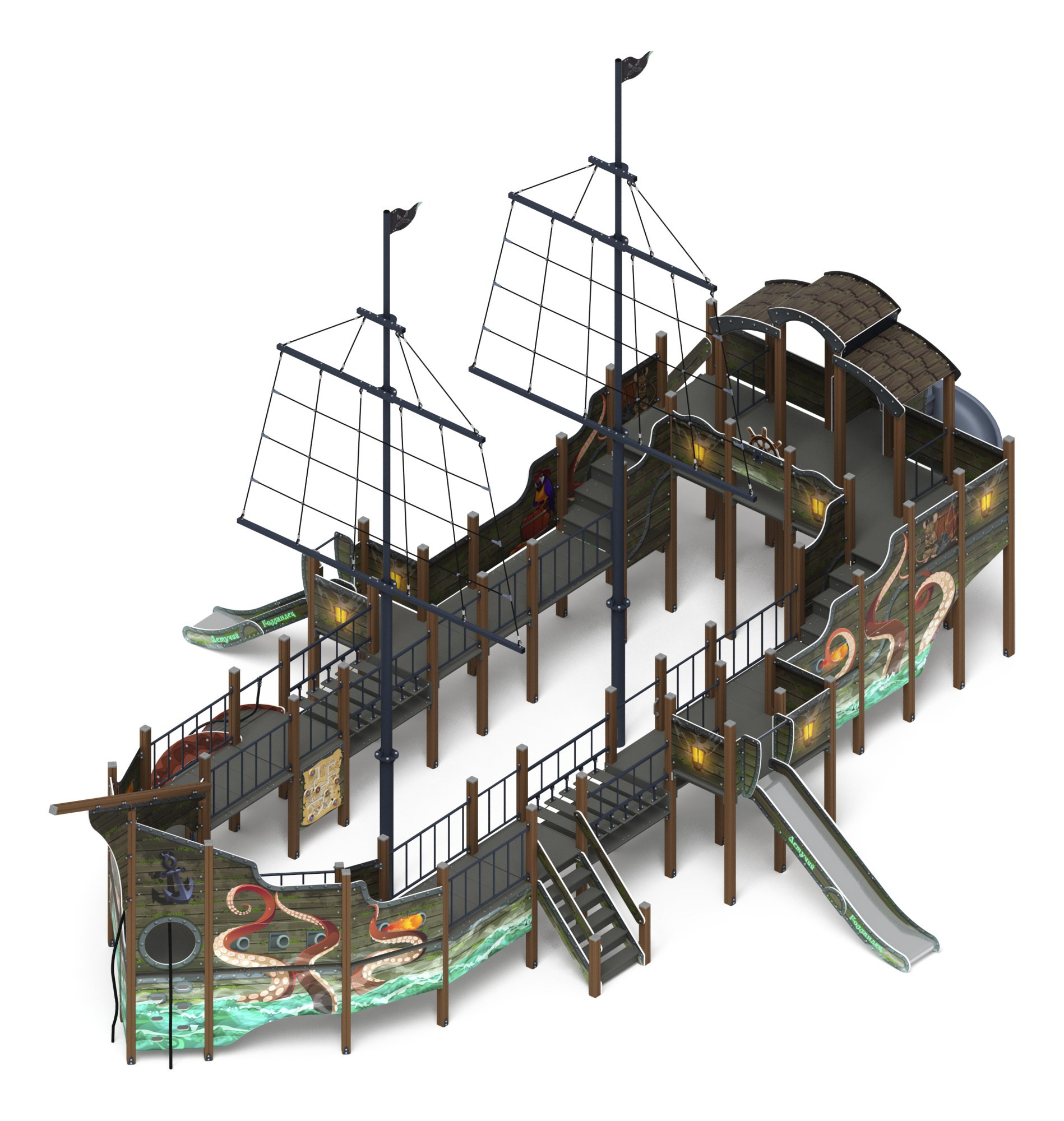 Баркентина (Летучий Голландец) - ДИК 2.03.3.06-11.И1 - Игровой комплекс (Винтовой скат) H=1200, Н=1500, Н=2000 Габариты (ШхДхВ): 22870х13850х9450 Зона безопасности, мм: 25870х17350 Скат горки: H=1200 (прямой скат) / H=1500 (винтовой скат) / H=2000 (винтовой скат) Возрастные ограничения от 5 до 12 лет