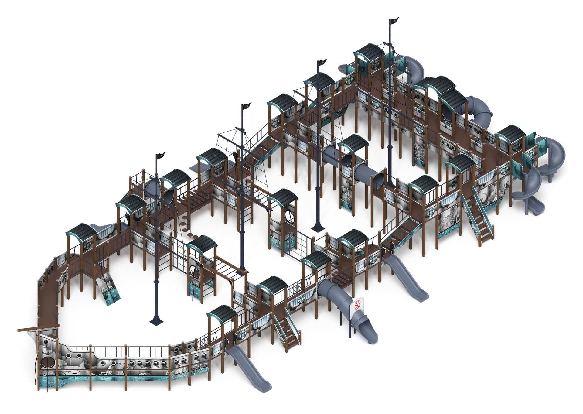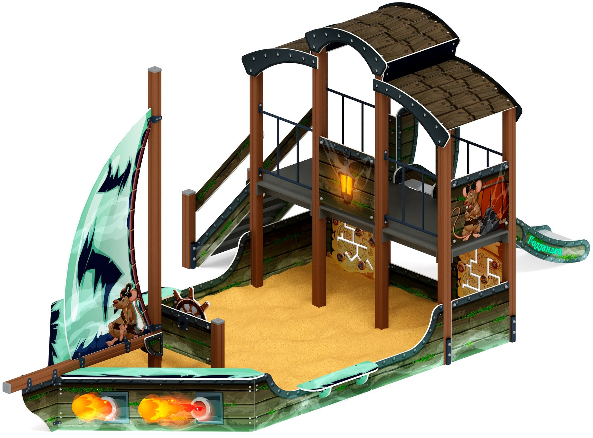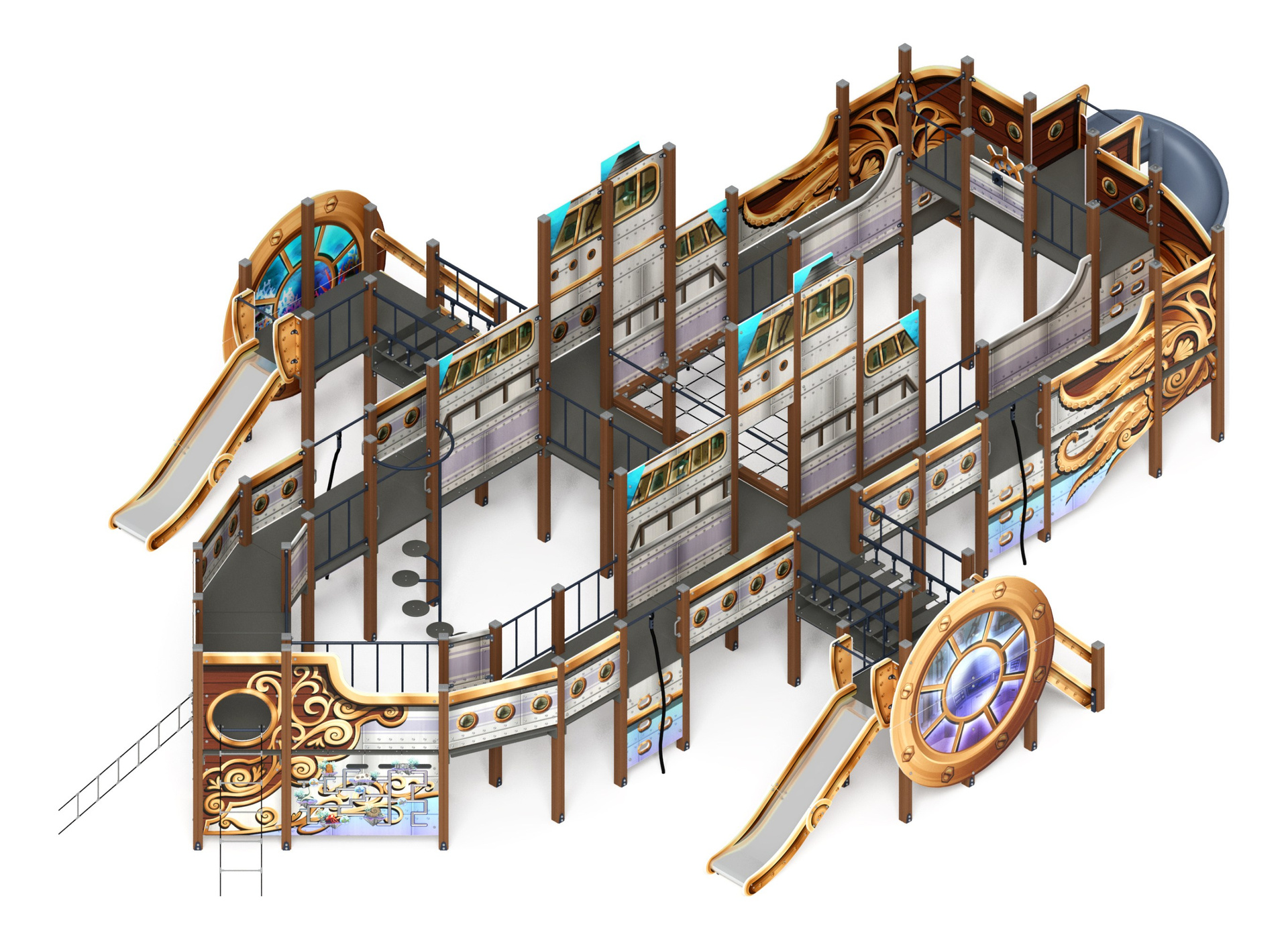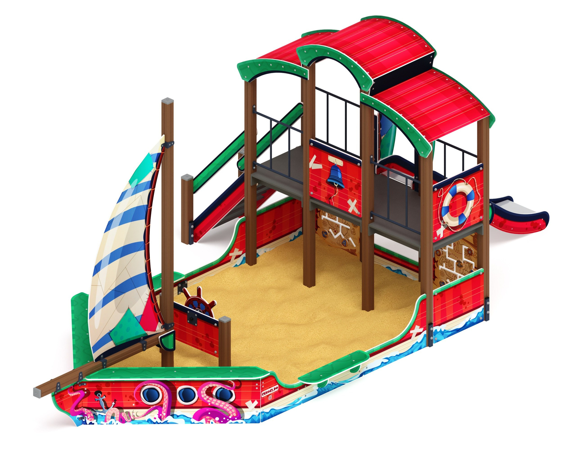 Баркентина (Летучий Голландец) - ДИК 2.03.3.06-11.И1 - Игровой комплекс (Винтовой скат) H=1200, Н=1500, Н=2000 Габариты (ШхДхВ): 22870х13850х9450 Зона безопасности, мм: 25870х17350 Скат горки: H=1200 (прямой скат) / H=1500 (винтовой скат) / H=2000 (винтовой скат) Возрастные ограничения от 5 до 12 лет