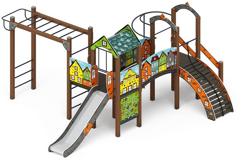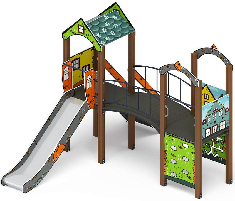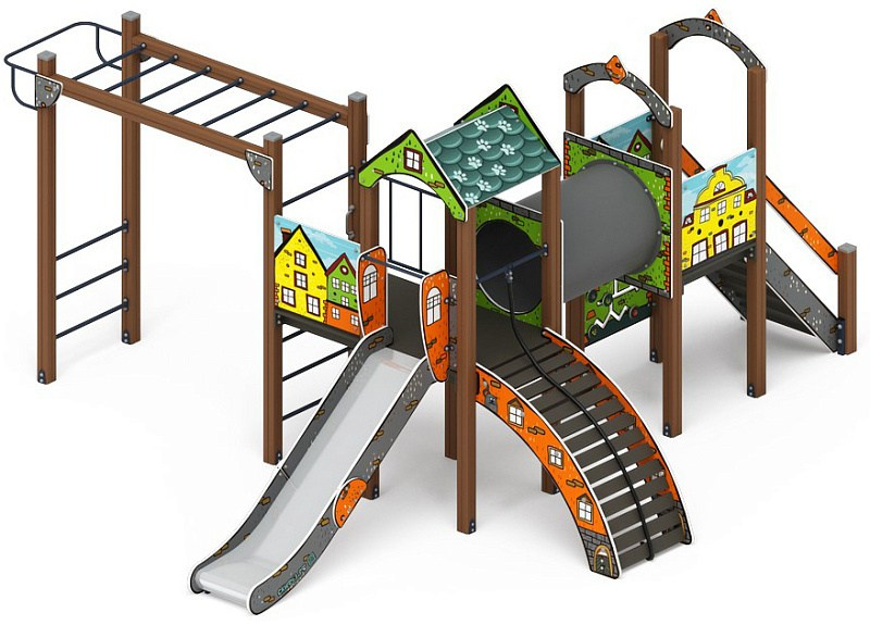 Рада (ЭКО) - ДИК 2.01.2.07-02 - Игровой комплекс H=1200 Габариты (ШхДхВ): 4080x5000x3000 Зона безопасности, мм: 5780х8000 Скат горки: H=1200 (металлический скат)