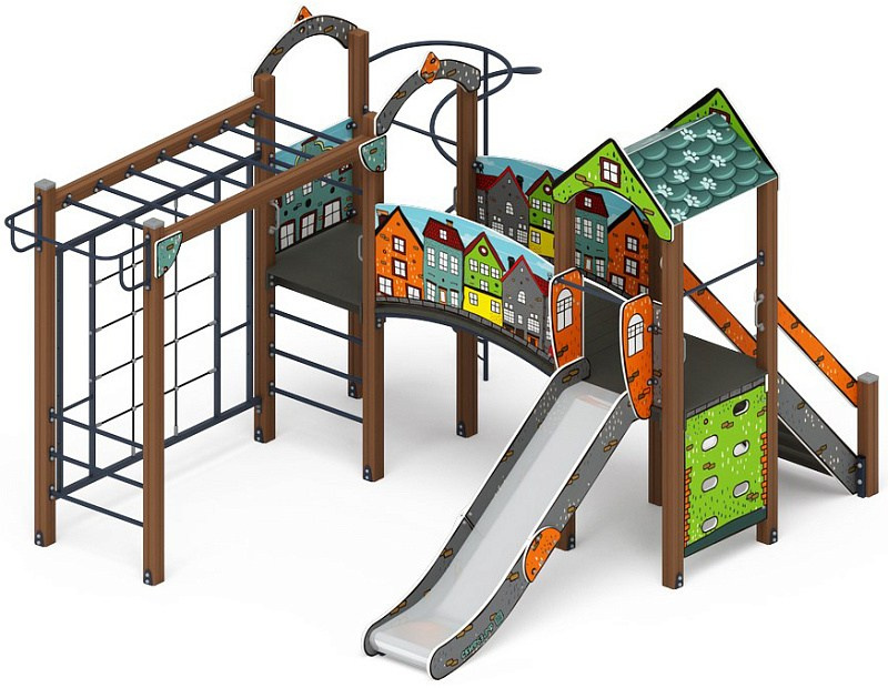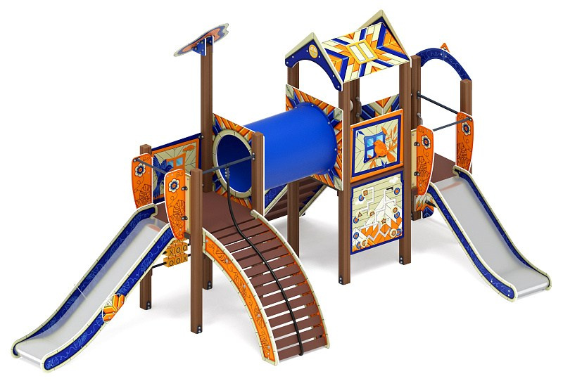 Рада (ЭКО) - ДИК 2.01.2.08-22 - Игровой комплекс H=1200 Габариты (ШхДхВ): 6260x5730x3000 Зона безопасности, мм: 9760х8730 Скат горки: H=1200 (металлический скат)