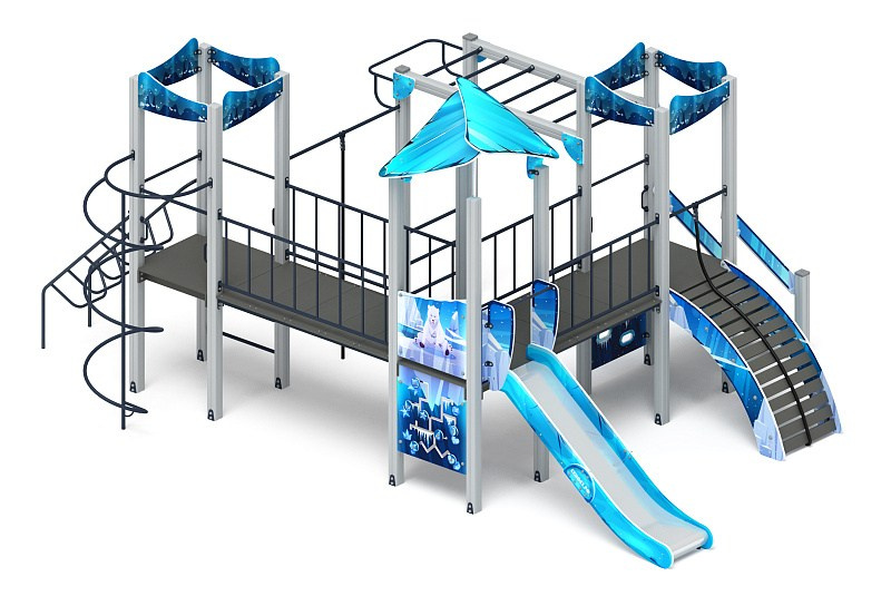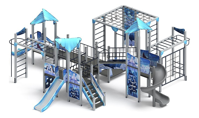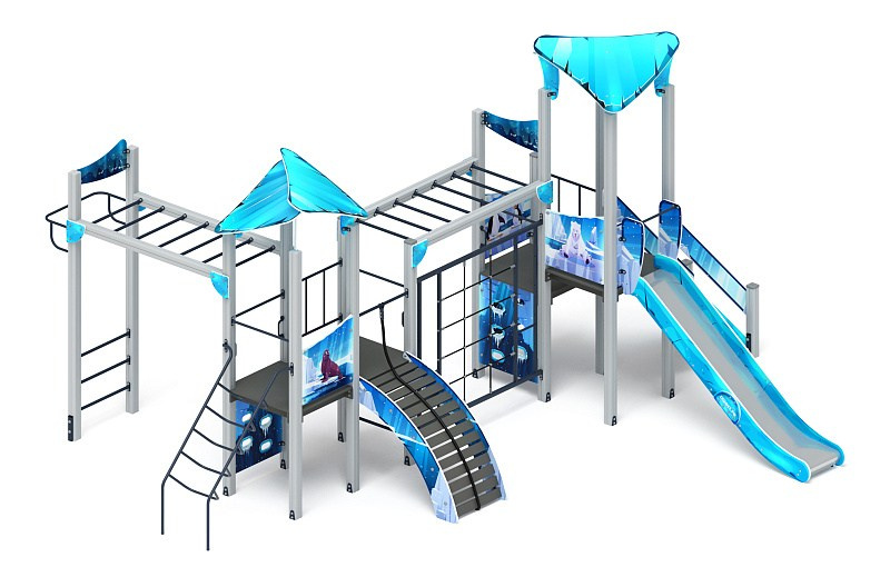 Волшебный город (Снежная королева) - ДИК 2.19.01-02 - Игровой комплекс Н=1500 Габариты (ШхДхВ): 6900x7380x4070 Зона безопасности, мм: 10380х10400 Скат горки: H=1500 (металлический скат)