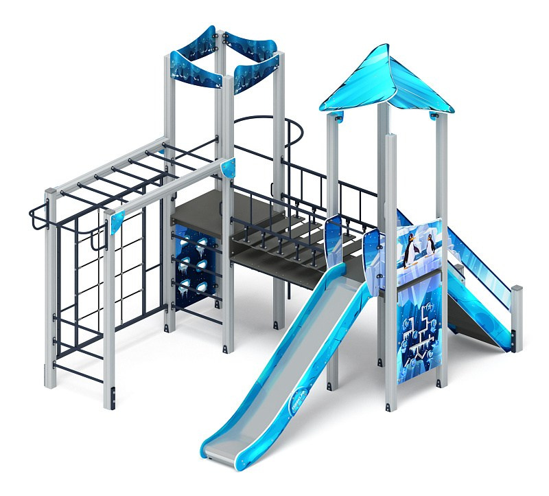 Волшебный город (Снежная королева) - ДИК 2.19.05-02 - Игровой комплекс Н=1500 Габариты (ШхДхВ): 3640x4800x4070 Зона безопасности, мм: 8300х6640 Скат горки: H=1500 (металлический скат)