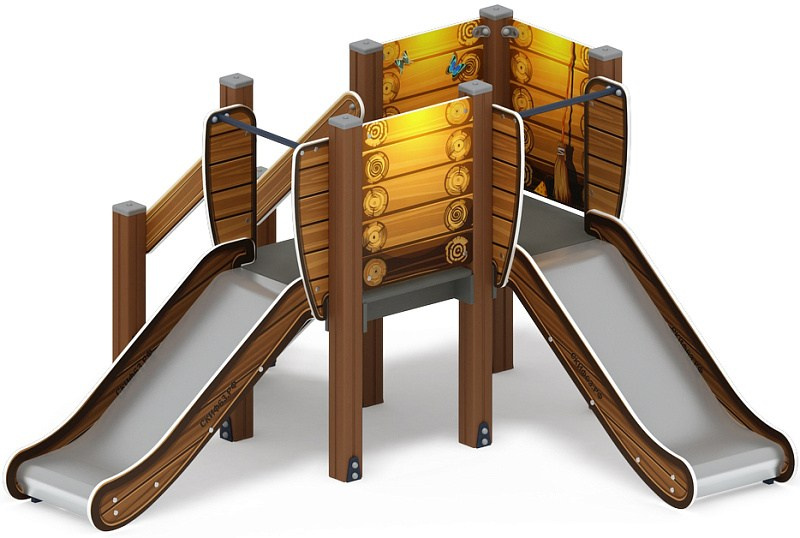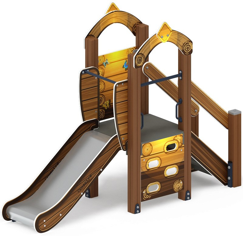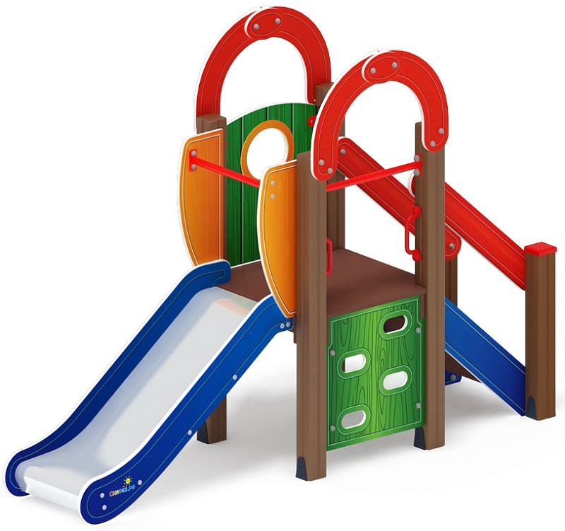 Горка двойная Малыш (Эко) - ИО 41.01.02-02 - Н=750 Габариты (ШхДхВ): 2670x2690x1500 Зона безопасности, мм: 6190х6170 Скат горки: H=750 (металлический скат) Возрастные ограничения от 3 до 10 лет