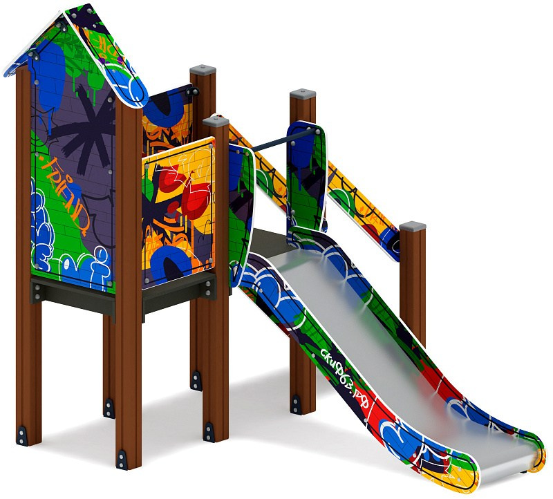 Горка Малыш (Граффити) - ИО 41.01.01-03 - Н=750 Габариты (ШхДхВ): 850x2670x2000 Зона безопасности, мм: 6170х3850 Скат горки: H=750 (металлический скат) Возрастные ограничения от 3 до 10 лет