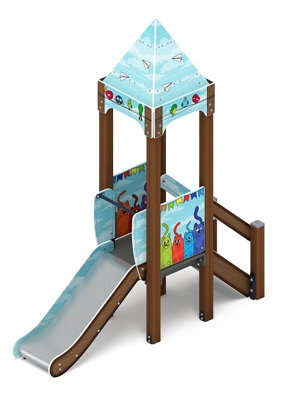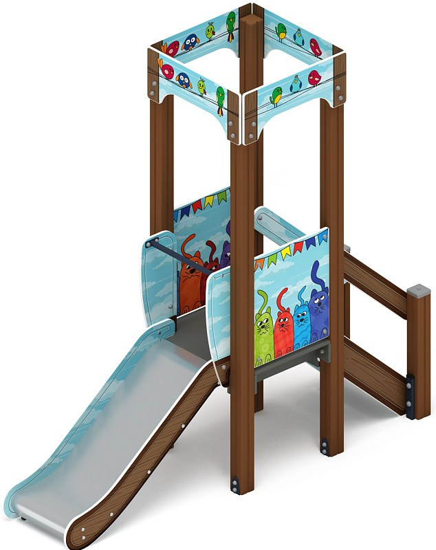 Горка - ИО 41.15.01-11 - Королевство (Коты) H=750 Габариты (ШхДхВ): 2670х820х2650 Зона безопасности, мм: 6170х3820 Скат горки: H=750 (металлический скат) Возрастные ограничения от 3 до 10 лет