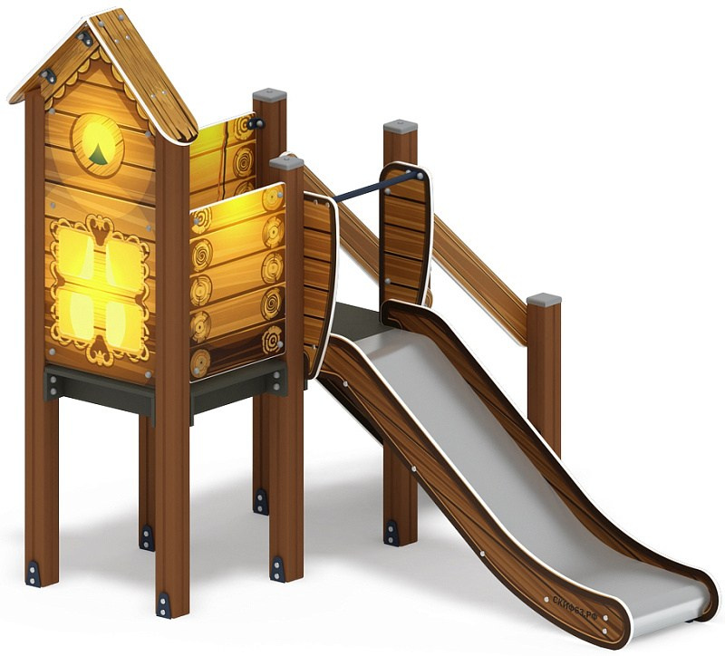 Горка с домиком - ИО 41.01.05-02 - (ЭКО) H=900 Габариты (ШхДхВ): 2400x2500x2400 Зона безопасности, мм: 5400х6000 Скат горки: H=900 (металлический скат) Возрастные ограничения от 3 до 10 лет