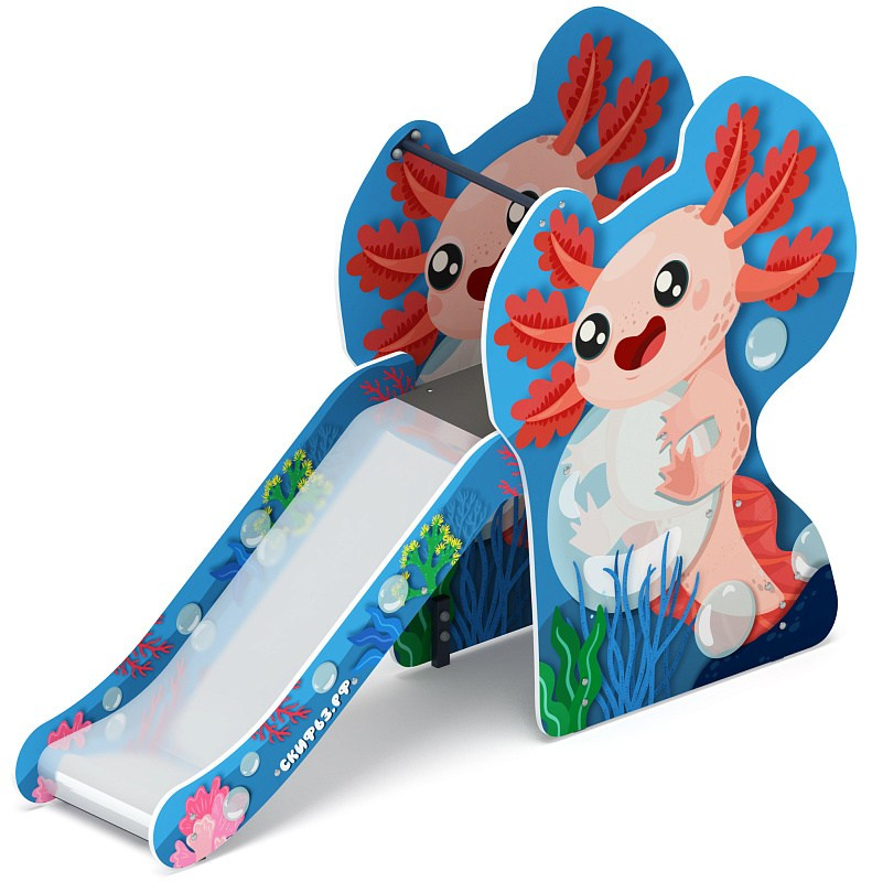 Горка Аксолотль - ИО 41.01.10 Н=750 Габариты (ШхДхВ): 2260х560х1600 Зона безопасности, мм: 5760х3560 Скат горки: H=750 (металлический скат) Возрастные ограничения от 3 до 12 лет, весом не более 70 кг