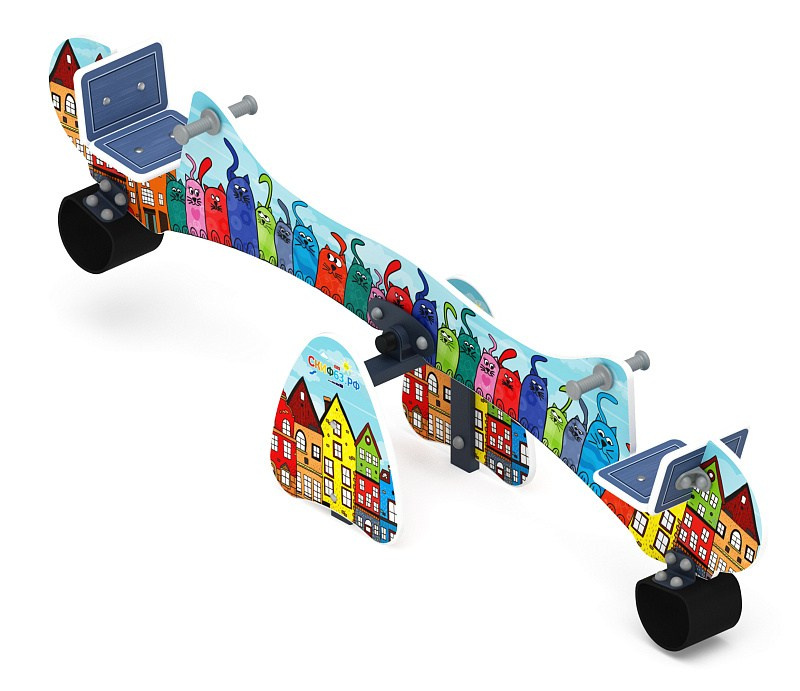 Качалка балансир со спинкой - ИО 21.Д.14.01-01.И1 - Космопорт (Коты) Габариты (ШхДхВ): 2200x400x600 Зона безопасности, мм: 4200х2400 Возрастные ограничения от 4 до 8 лет