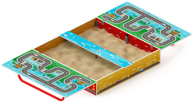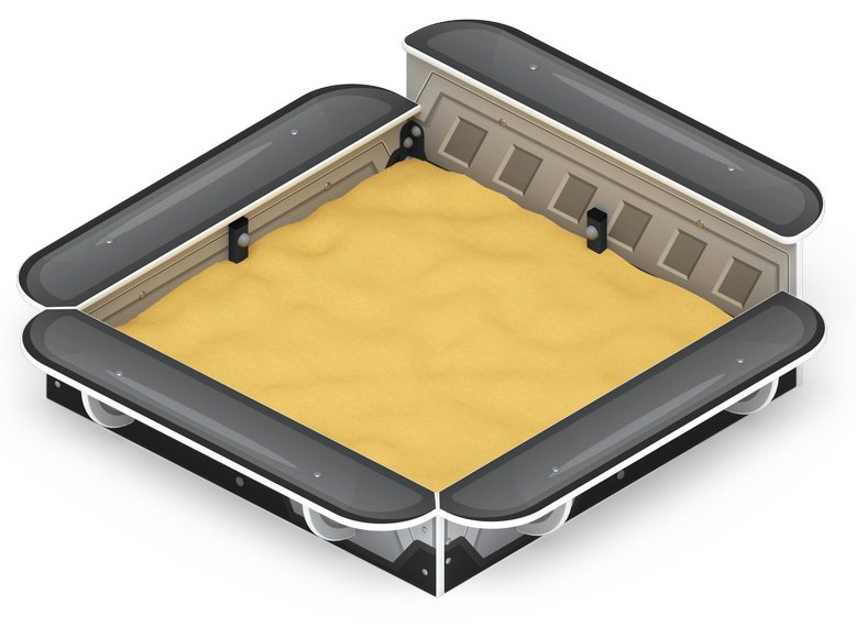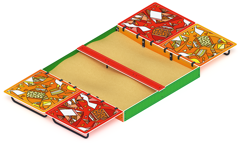 Песочница с крышкой средняя (Техно) - ИО 5.01.11-10 Габариты (ШхДхВ): в закрытом виде 1200х1240х443 в открытом виде 2380х1200х220 Зона безопасности, мм: 3380х2200