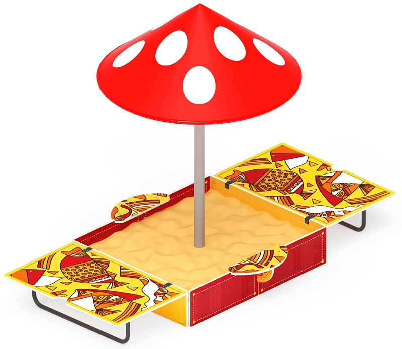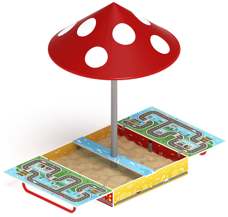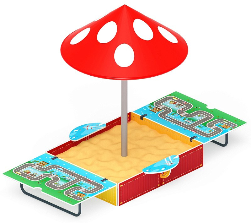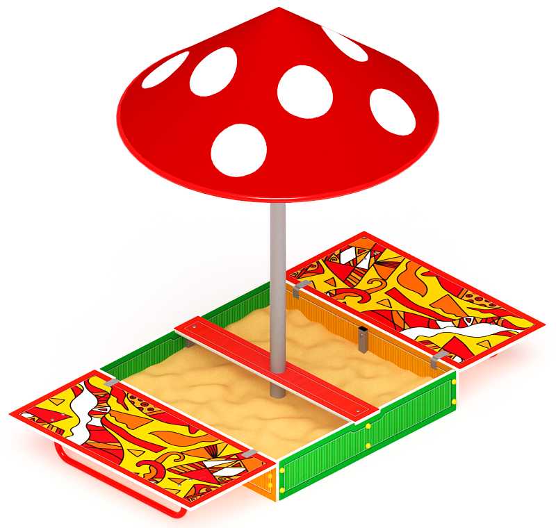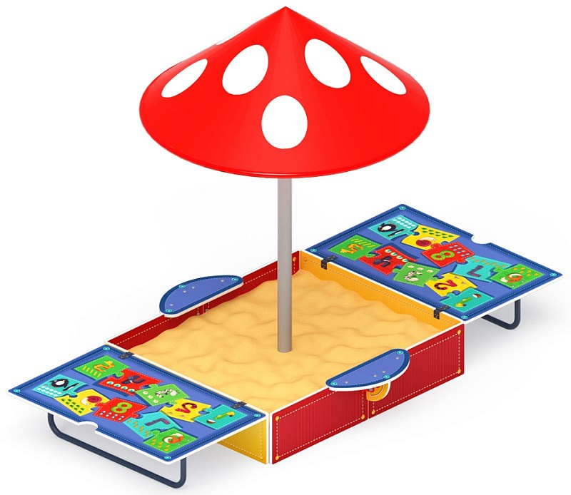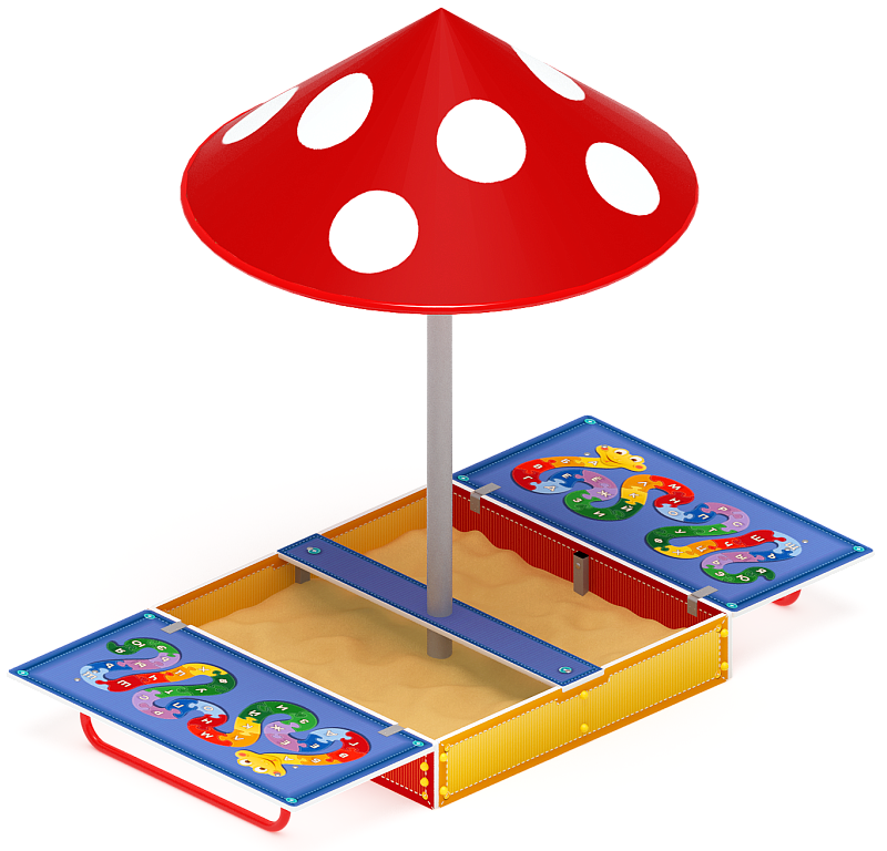 Песочница с крышкой средняя и навесом Грибок (Игра) - ИО 5.01.10-06 Габариты (ШхДхВ): в закрытом виде 1500х1500х2100 в открытом виде 2990х1500х2100 Зона безопасности, мм: 3990х2500