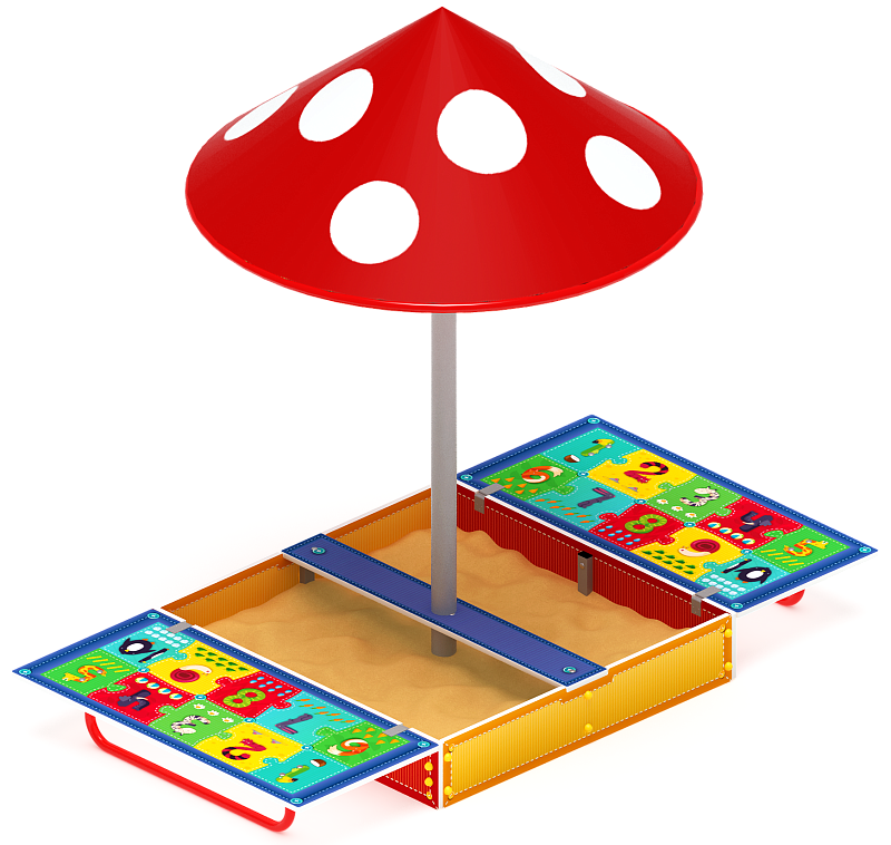 Песочница с крышкой средняя и навесом Грибок (Арифметика) - ИО 5.01.10-03 Габариты (ШхДхВ): в закрытом виде 1200х1240х2100 в открытом виде 2380х1200х2100 Зона безопасности, мм: 3380х2200