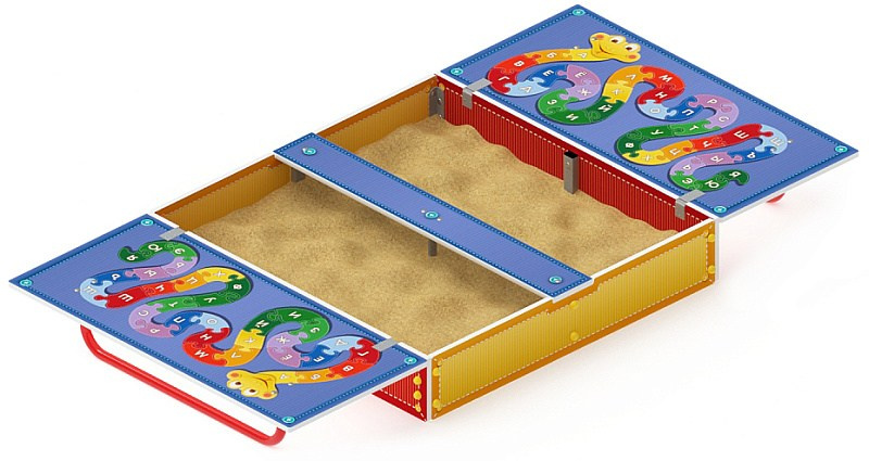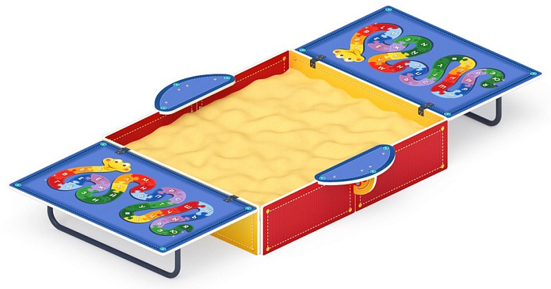 Песочница с крышкой средняя (Азбука) - ИО 5.01.11-01 Габариты (ШхДхВ): в закрытом виде 1200х1240х443 в открытом виде 2380х1200х220 Зона безопасности, мм: 3380х2200