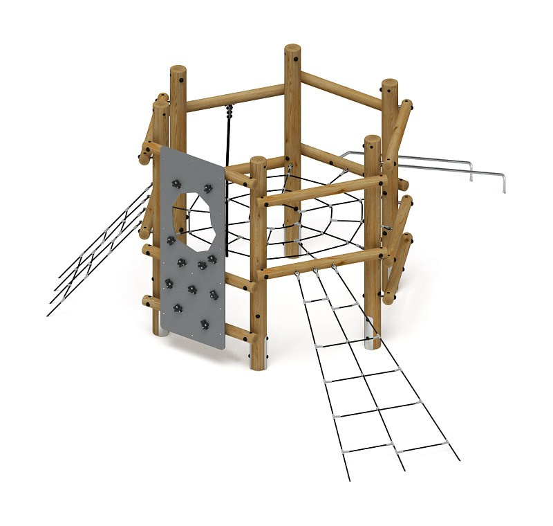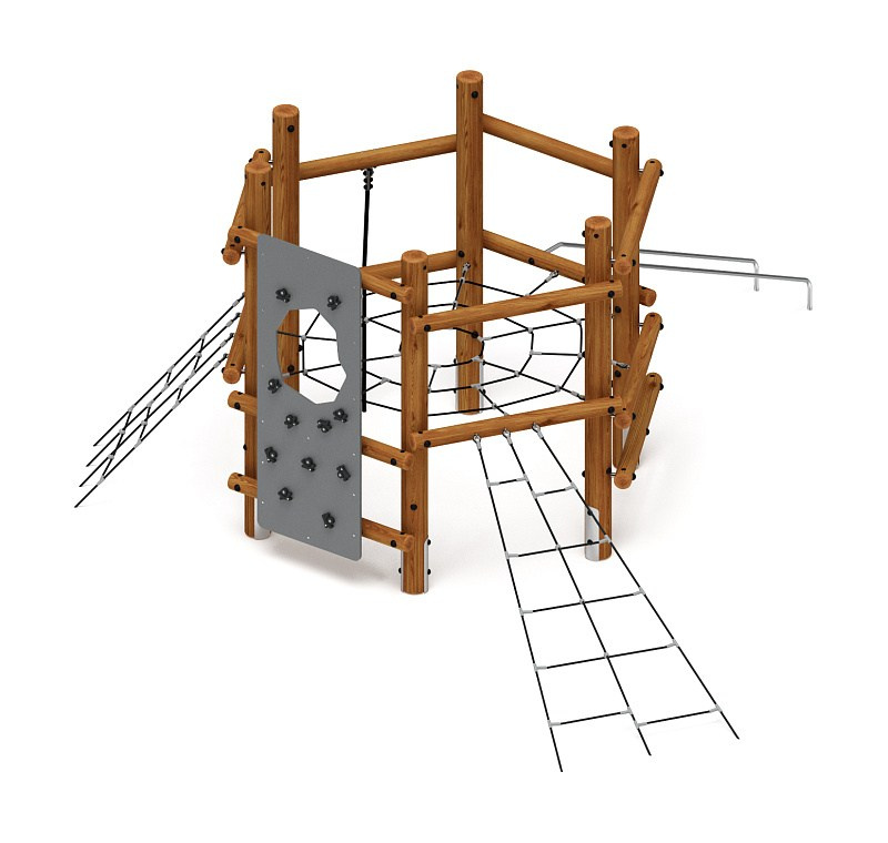 Спортивная серия (лиственница) СК 2.08.07-Л.И1 Габариты (ШхДхВ): 6100х5700х2800 Зона безопасности, мм: 9100х8700 Возрастные ограничения от 5 до 12 лет