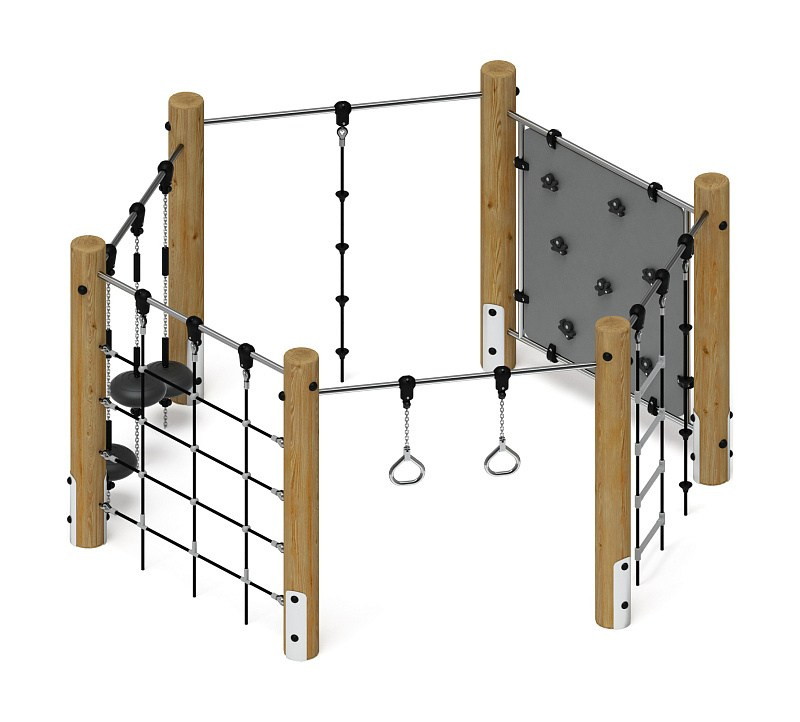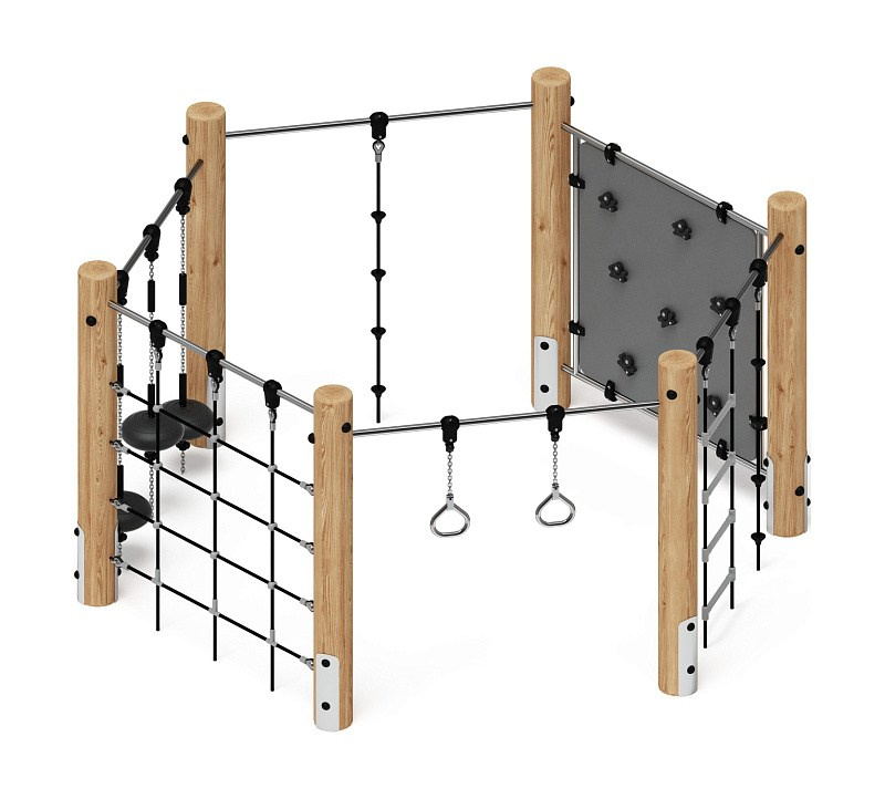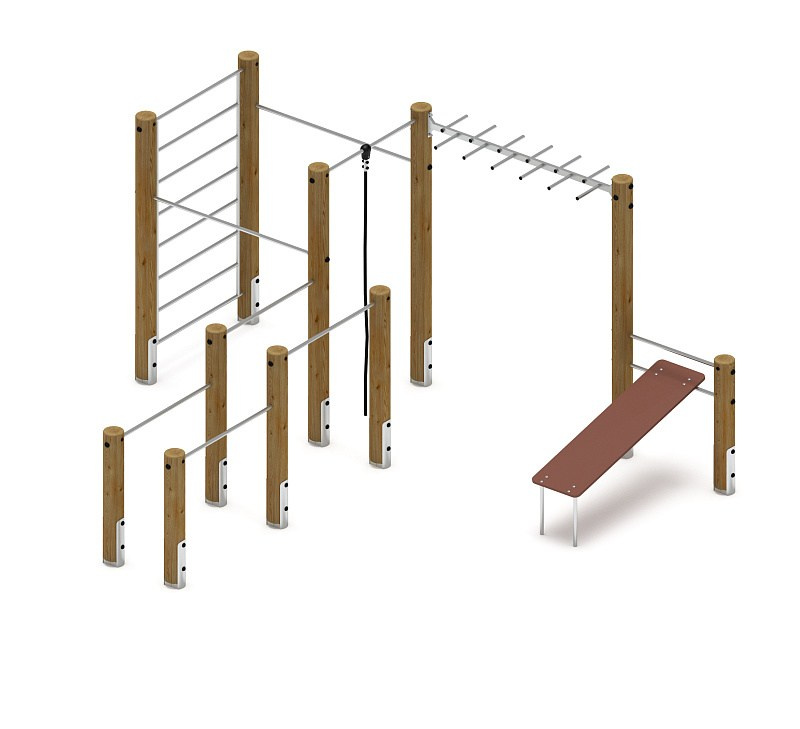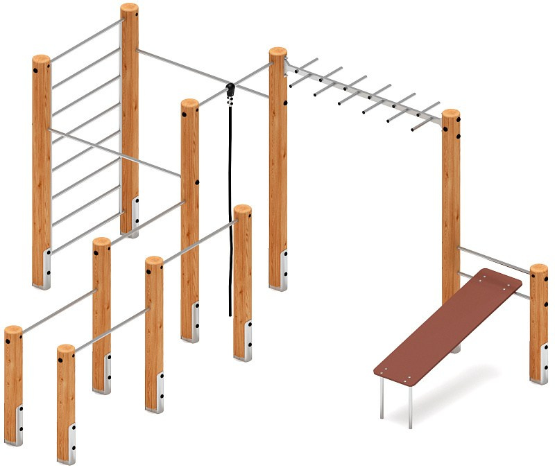 Спортивная серия (лиственница) СК 2.08.03-Л.И1 Габариты (ШхДхВ): 1970х300х2000 Зона безопасности, мм: 4970х3300 Возрастные ограничения от 5 до 12 лет